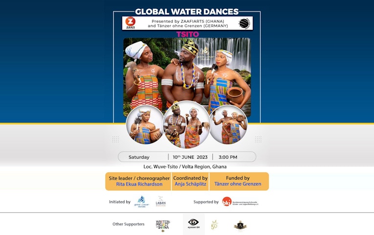 This is an experimental Dance-Theater performance story in the telling; Addressing the negative human effect on water bodies and the environment which are contributing to harsh climate change, water pollution and its dangers and measures to prevent these. The Project is a participation of GLOBAL WATER DANCE in Ghana Titled, “TSITO” - which simply translates in English as Water Rock or Water Bank which also happens to be the very name of the town representing Ghana as the project's Location site. Tsito Township is located in the southern part of the country. Its settlers are known as the ɛvɛdome people of Volta region and the language spoken is same as ɛvɛdome. This part of the country happens to be one of Ghana's beautiful geographical areas made up of many water bodies such as streams and lakes as well as gigantic rock formations and large areas of green vegetation. Tsito's main water bodies get their source from rocks scattered deep in the Tsito forest. These waters which trickle down towards gravity have created a number of streams and tributaries that go all the way to neighboring communities. These water bodies also serve as a source of natural water for the Volta Regional branch of the Ghana Water Company limited for treatment and distribution. These natural attractions and beautiful landscapes put Tsito Township in a better position in representing the Nation Ghana. Choosing and titling the project by this place, is with a calculated intent to better project the Global Water Dance initiative concept which is basically on environmental activism with regards to protecting and preservation of the natural habitat and waters. Unfortunately, the Tsito town is losing its green vegetation at an alarming rate. Forests lands around streams and lakes in the Tsito enclave are owned by families. Due to greed and economic challenges, some of these families and their elders are selling their portions to private developers who end up falling the trees around the water bank for businesses. These developers have no reforestation policies hence the lands are left bare after falling the trees. Another alarming activity endangering the marine lives and the communities along our water bodies is illegal sand winning on the banks of the rivers and the shores of the seas. This activity affects the turbidity of the water bodies, leaves gorges on the banks and creates flat shores which allows the sea to take over villages and territories along the beaches. A typical example- in some parts of the country located by the Sea like most parts of the beaches along the Anlo and Keta stretch, the Sea has claimed a large part of the territory and villages along its shores, rendering the local folks homeless. Part of this was as a result of consistent sand winning at the shores which went unchecked over a long period of time. Probably some of the chiefs and leaders were involved hence the audacity of its continuation by the perpetrators. In the light of these and many other environmental degrading activities, we at ZAAFI BLACK ARTS AND HOME (ZAAFI ARTS) in partnership with DANCERS WITHOUT BORDERS ORGANIZATION in Germany and some renowned local organizations, media houses, individuals as well as the Chief and traditional council of Tsito (who happens to be an environmental activist himself) have put up this Dance-Theater performance towards the GLOBAL WATER DANCE FESTIVAL which is themed WATER and CLIMATE CHANGE and the sole aim is to sensitize all and sundry on the effects of their negative environmental activities. Collaborating to perform with Street Dancers, Folk Dancers and Musicians and also holding workshops in the community schools (basic to senior high level) and traditional durbar centers in the presence of the local people and the Chiefs and Elders as we give awareness through entertainment on the dangers of water pollution and destructive not only to water life, but also the environment and human life.